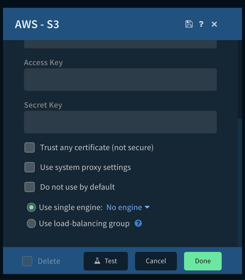 - Secret Key: add the Secret key that you saved when creating the IAM user.