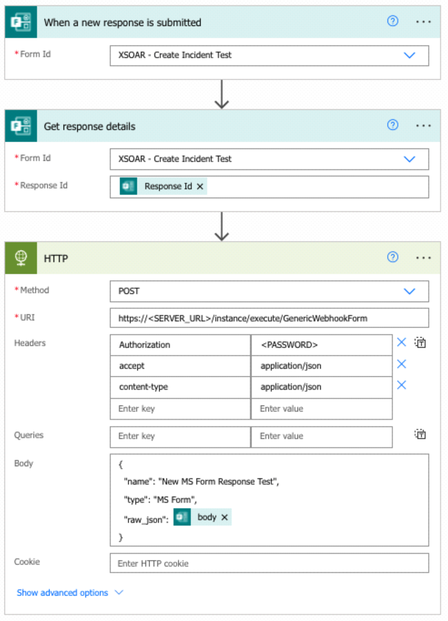 Use Microsoft Forms as the trigger to create new Cortex XSOAR incidents. This allows you to connect Microsoft Forms to your integrated toolset through the power of Cortex XSOAR.
