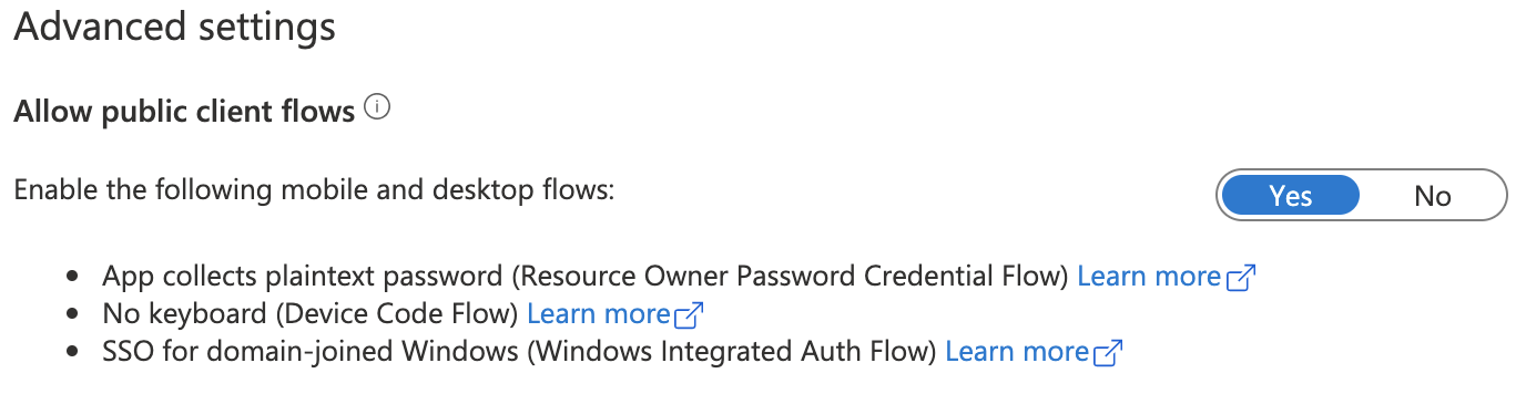 https://localhost.In the app registration, navigate to Authentication. Under Supported account types, select Accounts in any organizational directory (Any Azure AD directory - Multi-tenant). On the same page, under the Advanced Settings section, enable the mobile and desktop flows.