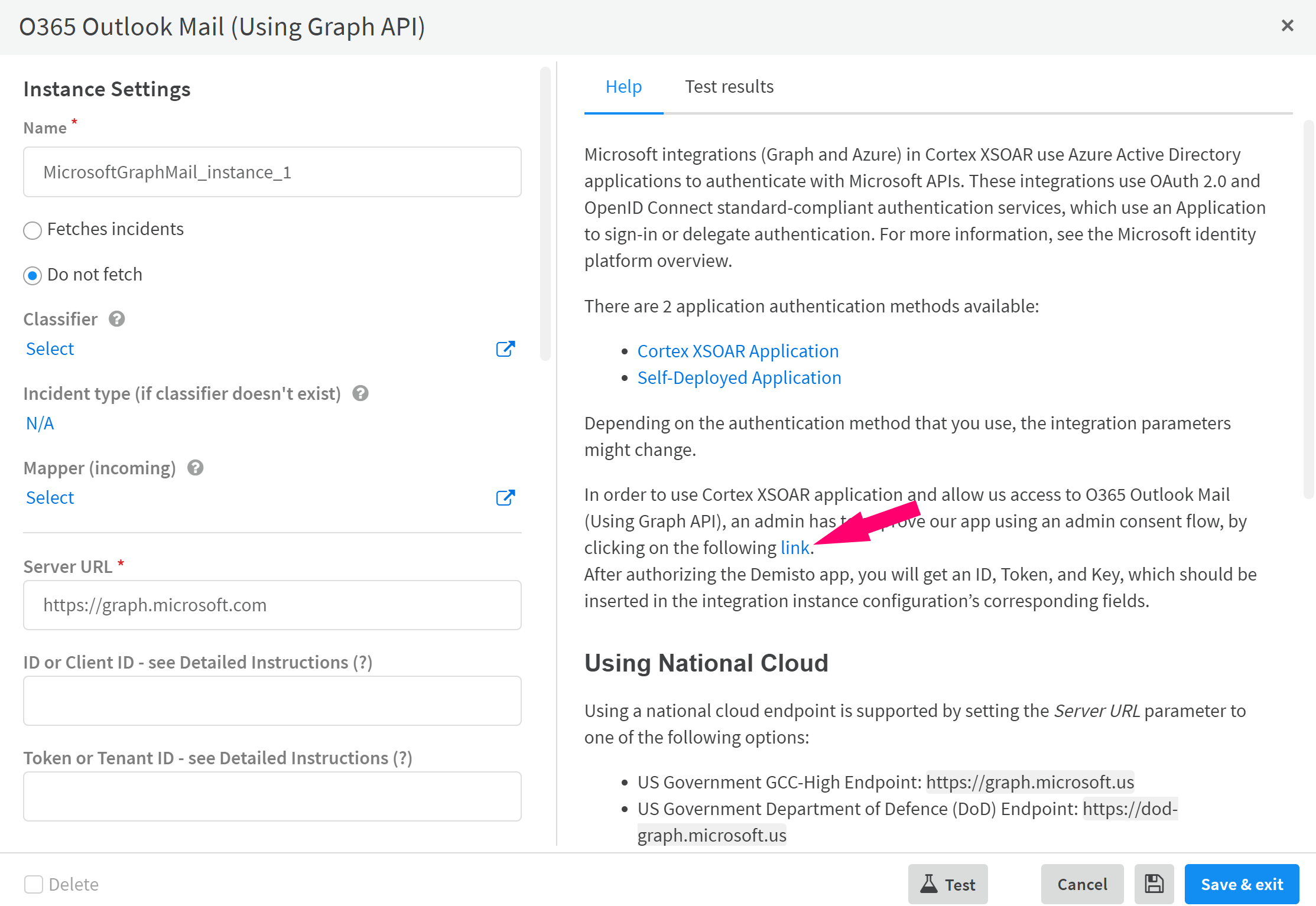 Save the instance and test the setup by running the !msgraph-user-test command from the Cortex XSOAR/XSIAM CLI.
