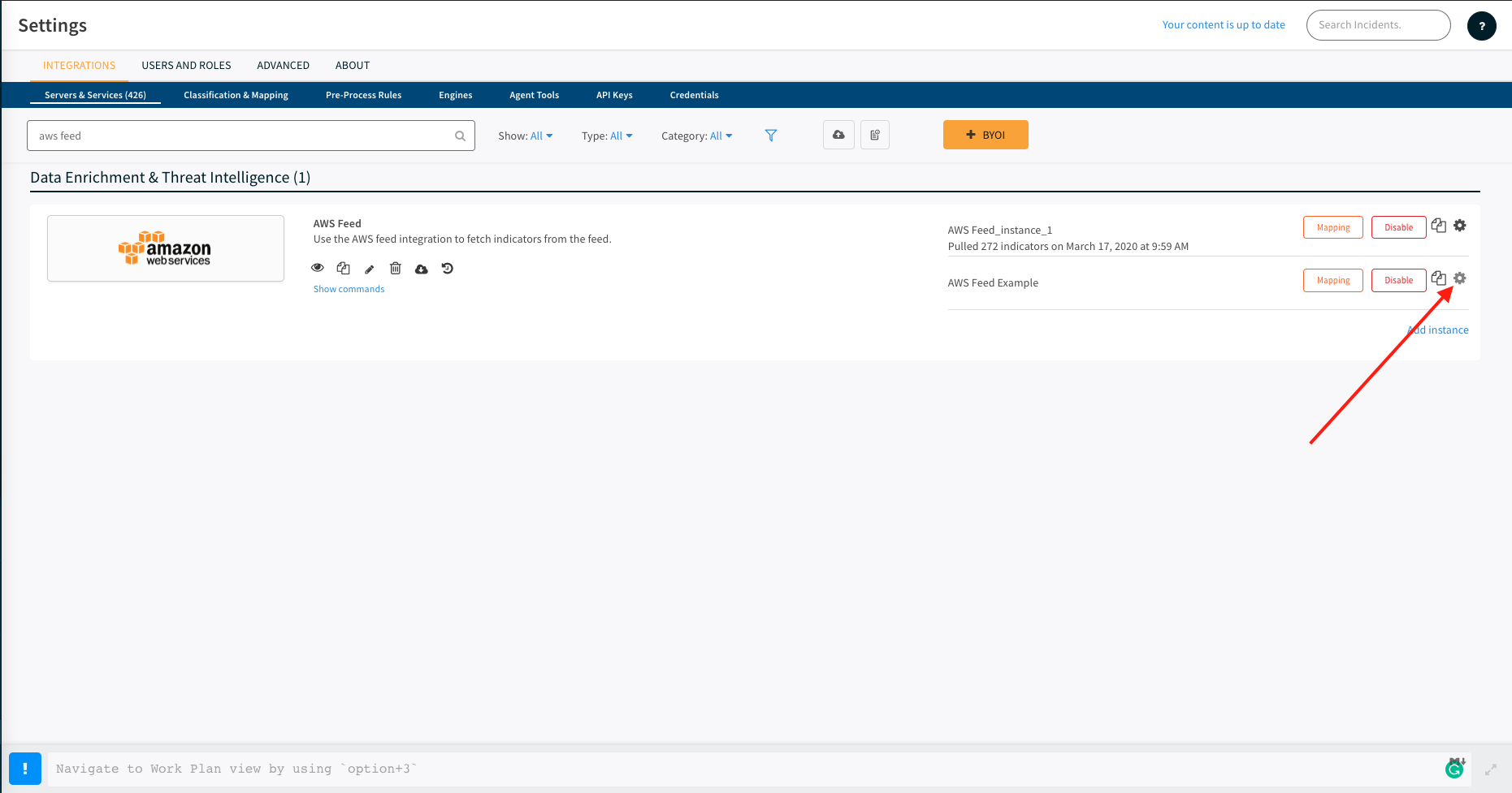 Let's see how to configure the allow-ip_aws_ec2 MineMeld node, whose prototype is aws.EC2, in Cortex XSOAR. If we want to leave the parameter values for fetching from this feed source the same as what we had for fetching indicators from CLOUDFRONT, then there is no need to even create a new instance. Click the cog icon next to the instance we already configured.