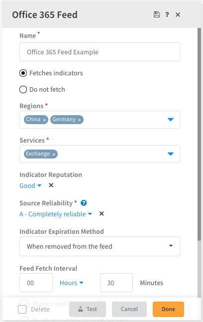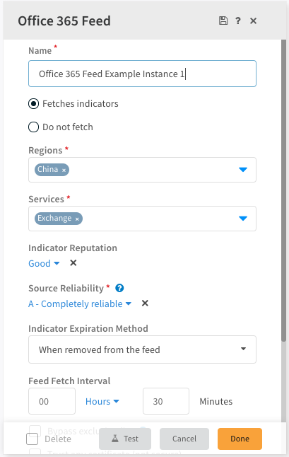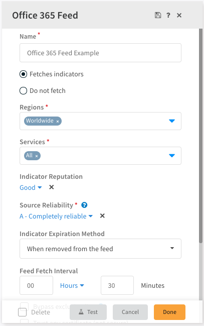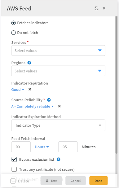 As you can see in the screenshot above, Cortex XSOAR provides default values for many of the configuration parameters, as determined by the source of the feed. To configure the integration instance to fetch from the same source as the MineMeld node we are migrating from, we do not need to make any adjustments because the default values for the Regions and Services configuration parameters are Worldwide and All respectively, which are the values we need to migrate this particular prototype.