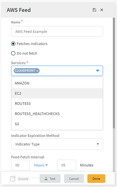 Now, both CLOUDFRONT and EC2 are selected for this instance. Click Done and this AWS Feed integration instance will now fetch indicators from AWS's CLOUDFRONT and EC2 feeds.