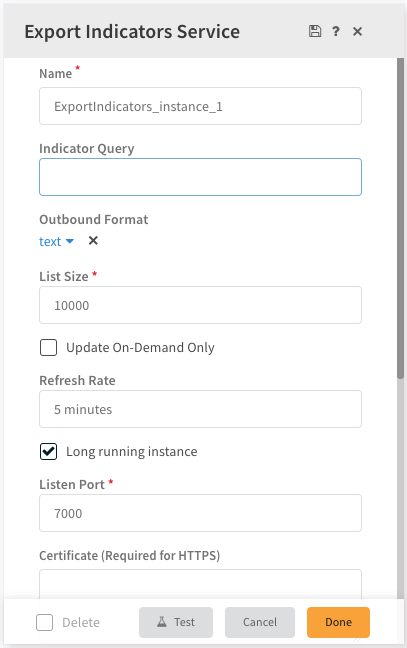 In Cortex XSOAR the data flow is based on two integration types: feed integrations and outbound integrations. Cortex XSOAR provides dedicated out-of-the-box feed integrations for many feed sources, as well as generic feed integrations that you can configure to work with many feed sources. In MineMeld, the outputs of a miner node (the indicators fetched from a feed source) need to be specified as the input of other node(s). However, in Cortex XSOAR, all indicators fetched from feed integrations flow into the Cortex XSOAR instance's indicator store. Since the Cortex XSOAR indicator store already supports the mechanism of searching and filtering indicators, we are able to condense what in MineMeld was the flow of indicators into a processor node and then an output node. We do this by configuring a single instance of the Export Indicators Service integration. When configuring an instance of the Export Indicators Service integration, we can enter an indicator query (using the query syntax you would use to search and filter indicators in the Indicators page of the Cortex XSOAR platform), which determines the indicators that will be made available from this integration instance for external consumption.