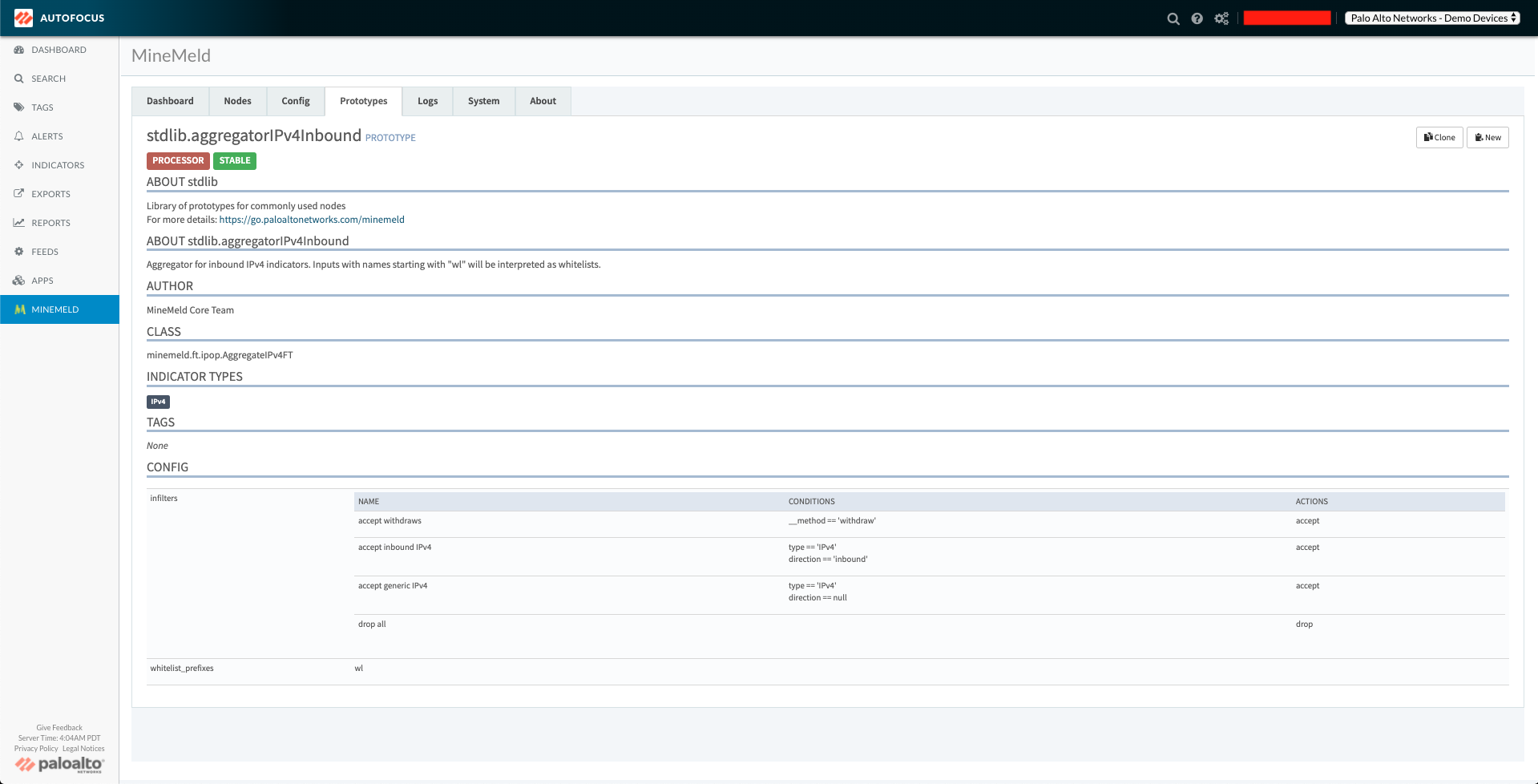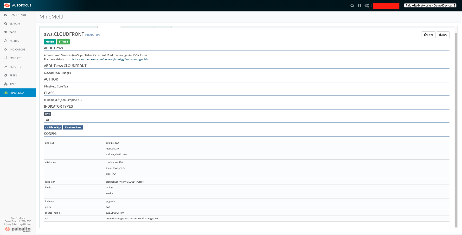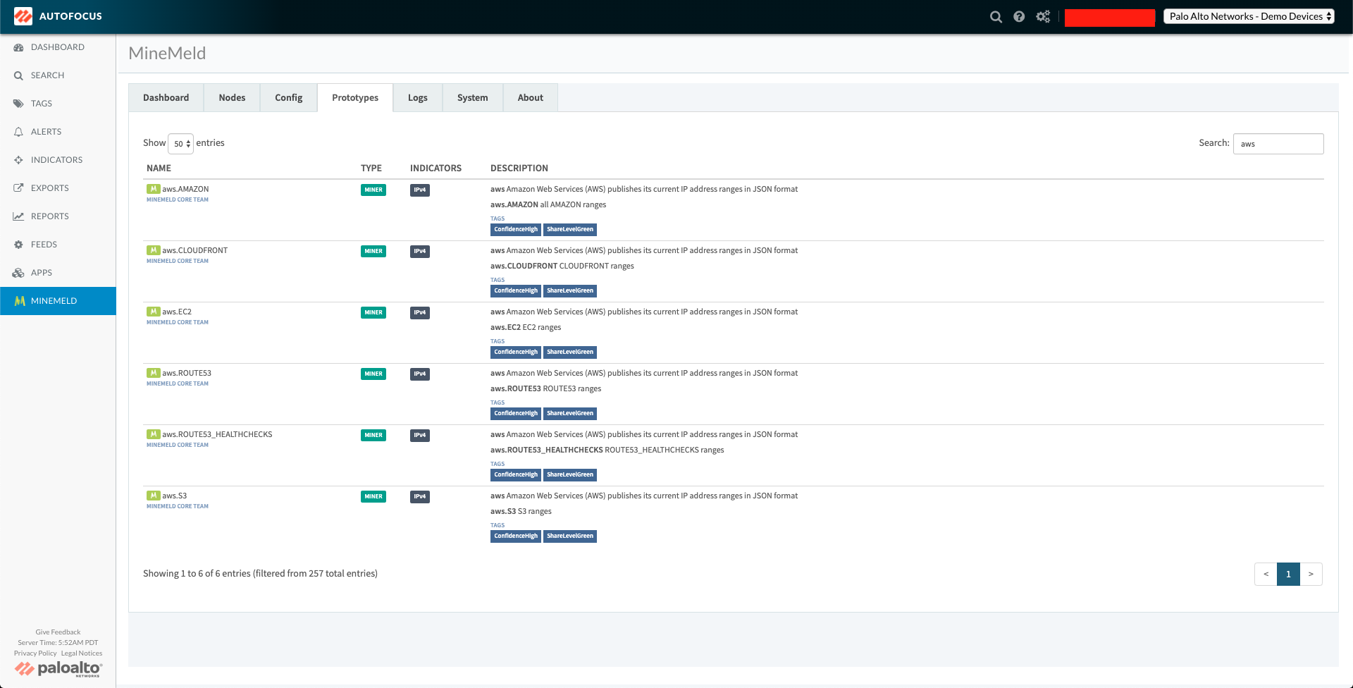 There is a node named allow-ip_aws_cloudfront which uses the prototype aws.CLOUDFRONT. The aws prototypes appear in the AutoFocus-hosted MineMeld UI as in the following screenshot.
