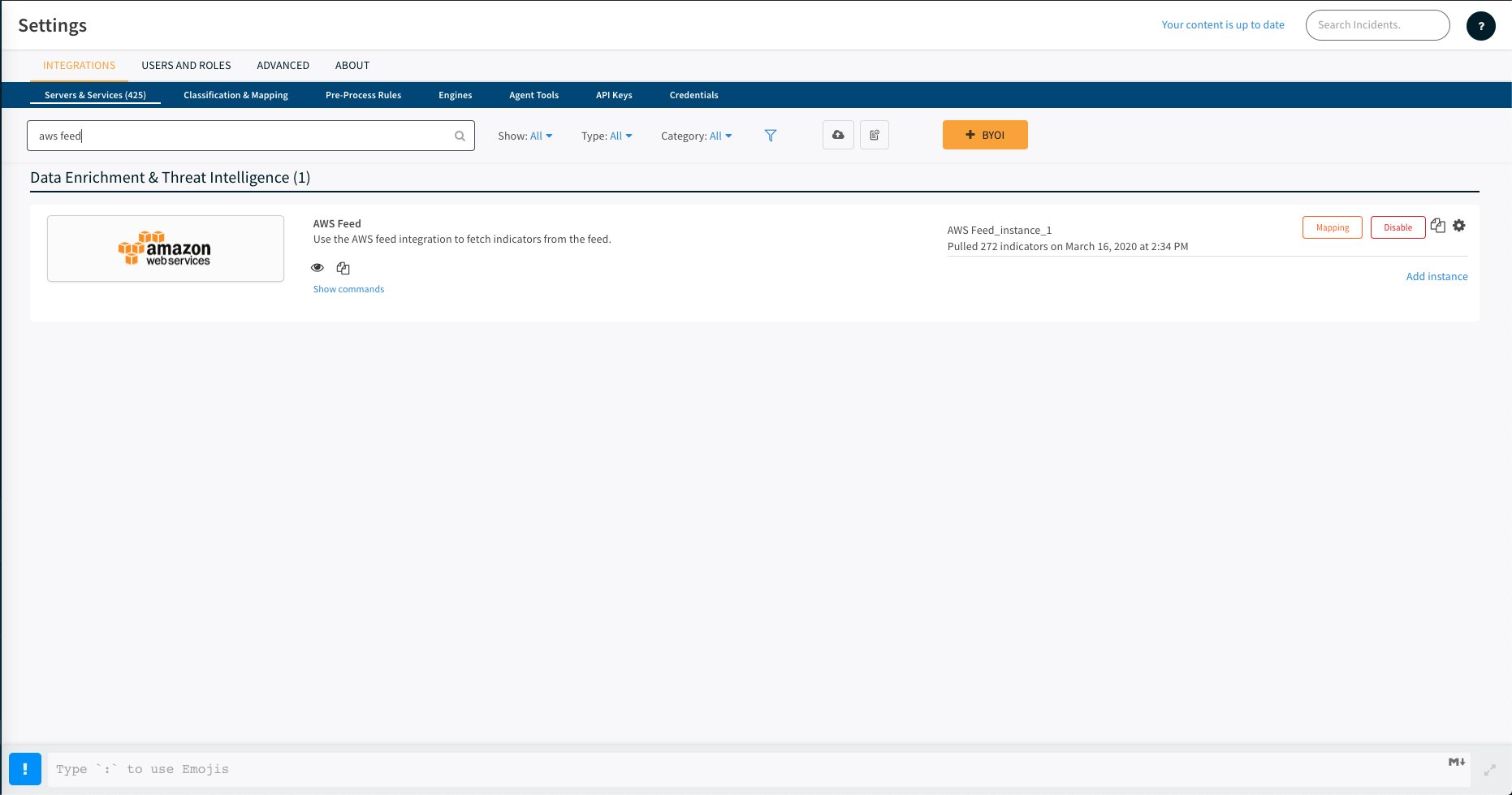 Let's look at the AWS Feed integration and see how to take these attributes from the MineMeld prototype and translate them to Cortex XSOAR. As shown in the screenshot below, if we do a search for 'aws feed', the AWS Feed integration appears.