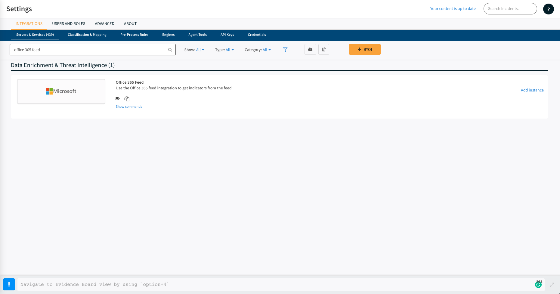 Let's look at the Office 365 Feed integration and see how to take these attributes from the MineMeld prototype and translate them to Cortex XSOAR. As shown in the screenshot below, when we search for 'office 365 feed', the Office 365 Feed integration appears.