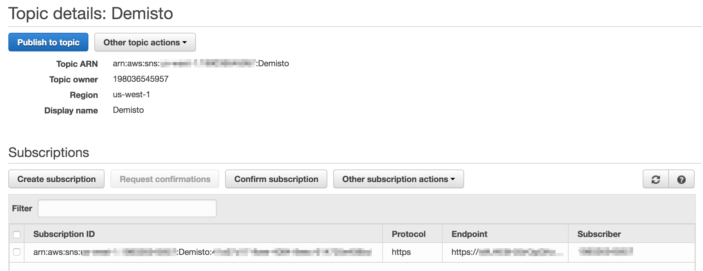 [https://<demisto-api-key>@<demisto-server-url>/incident/aws/sns](https://@/incidents/aws/sns)To create the Demisto API key, navigate to Settings > Integrations > API Keys. - Click Create Subscription and wait a few seconds for the XSOAR server to approve the subscription request.