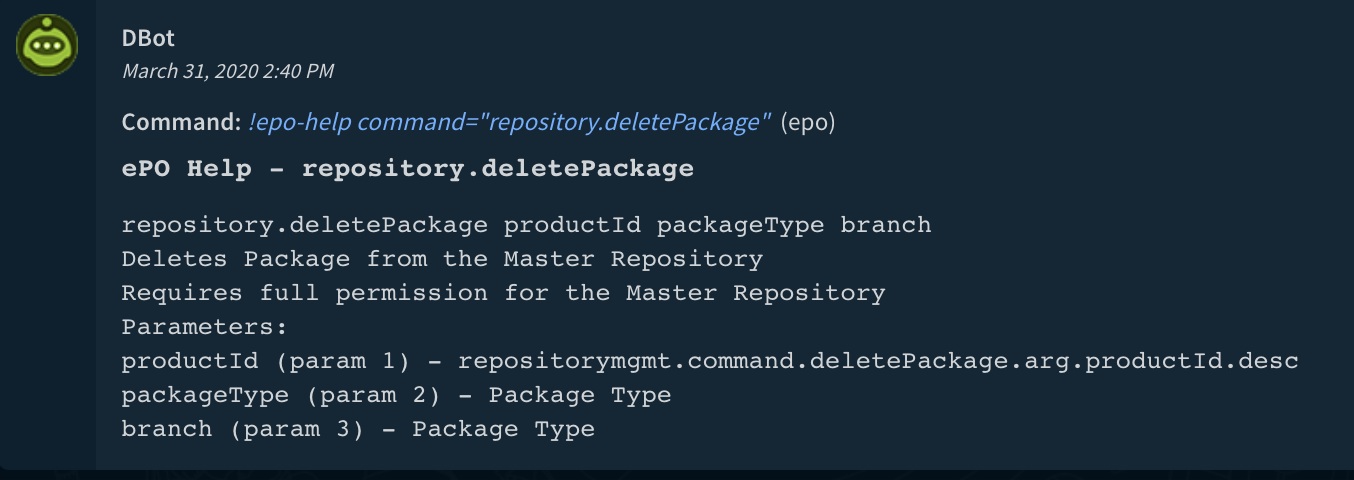 Displays help (information) for ePO commands. If no command argument is specified, returns all ePO commands.