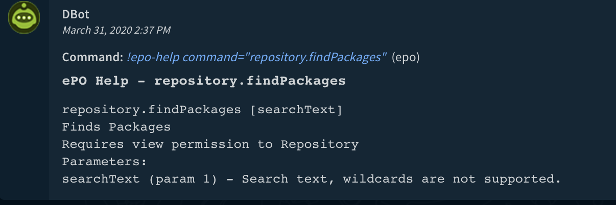 McAfee ePO has a highly flexible and powerful permissions system. The permissions required for the user who uses this integration depend on which operations they need to perform. The API user should have the same permissions a regular user would have in order to access the data via the UI. It is possible to view the exact permissions needed for a specific command by running the !epo-help command. The !epo-help command's output will include help information for the specific command including required permissions.